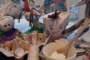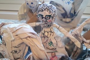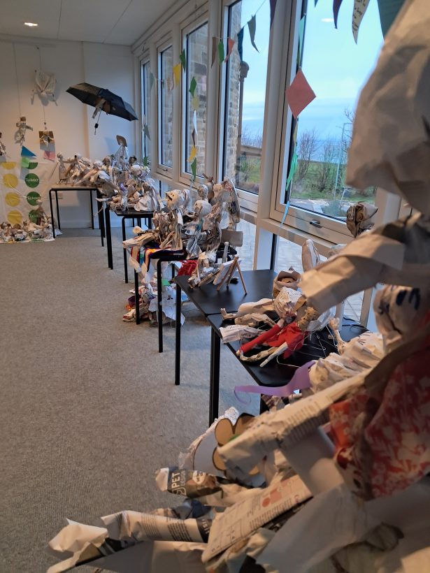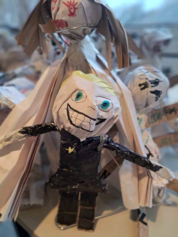Stefan recorded the contributions of participants and edited this into an audio backdrop to an exhibition of all the puppets at Rosehill Theatre in October 2025. There were over 130 puppets and they were arranged into tableaux with the puppets having fun – reflecting the fun that was had in the creative sessions.